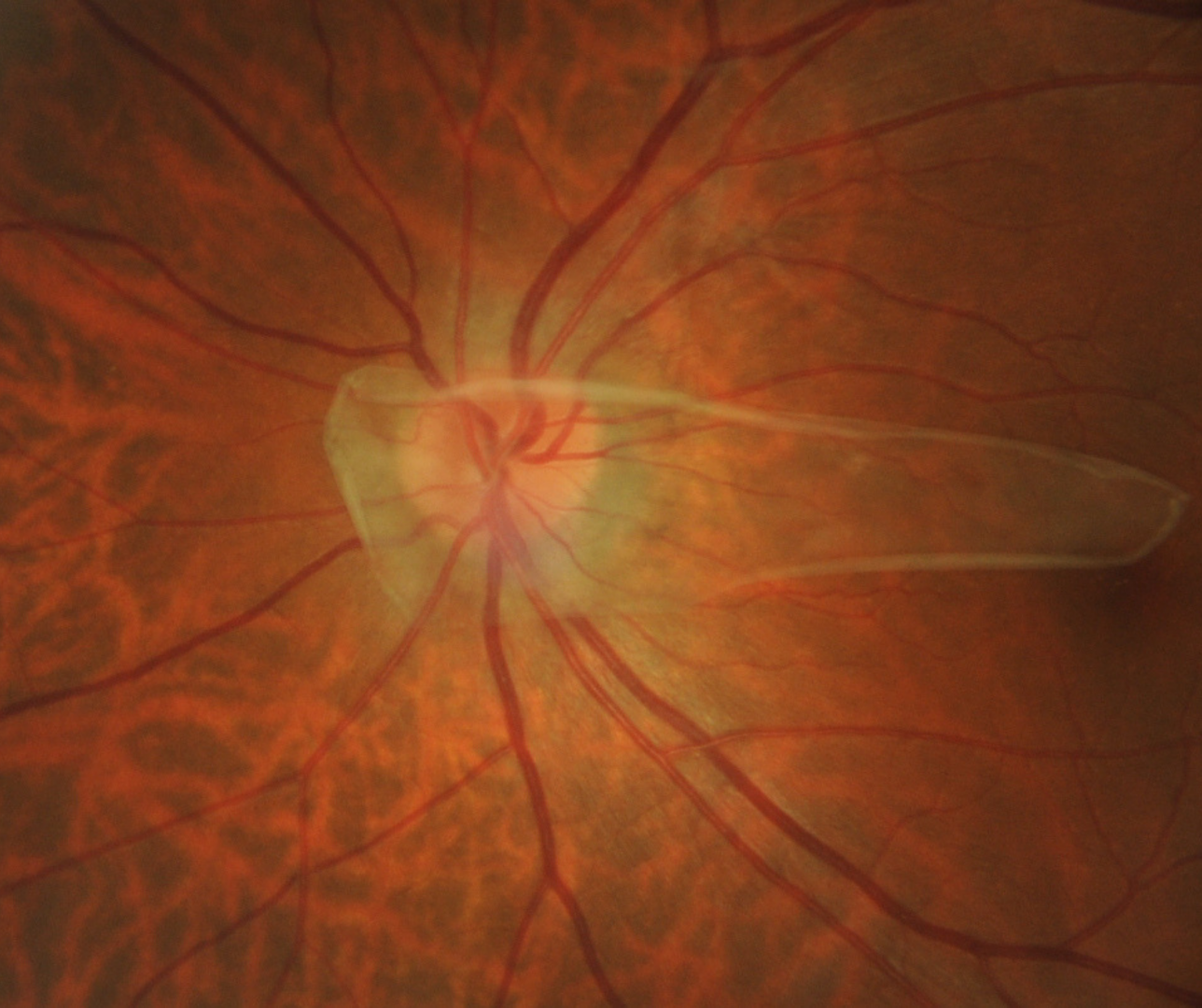 Fundus photography shows whitish collection of glial tissue anterior to the disc. The size and opacity of the tissue is dependent on the extent of remnant hyaloid artery.
