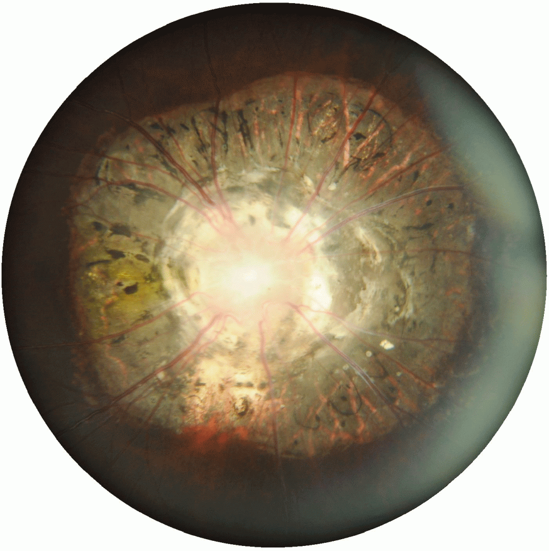 This anomaly is characterised by a funnel-shaped excavation of the optic disc with straight, radial retinal vessels emerging from the disc. A white glial tuft is typically seen at the centre of the optic disc and the peripapillary region may show annular hyperpigmentation.