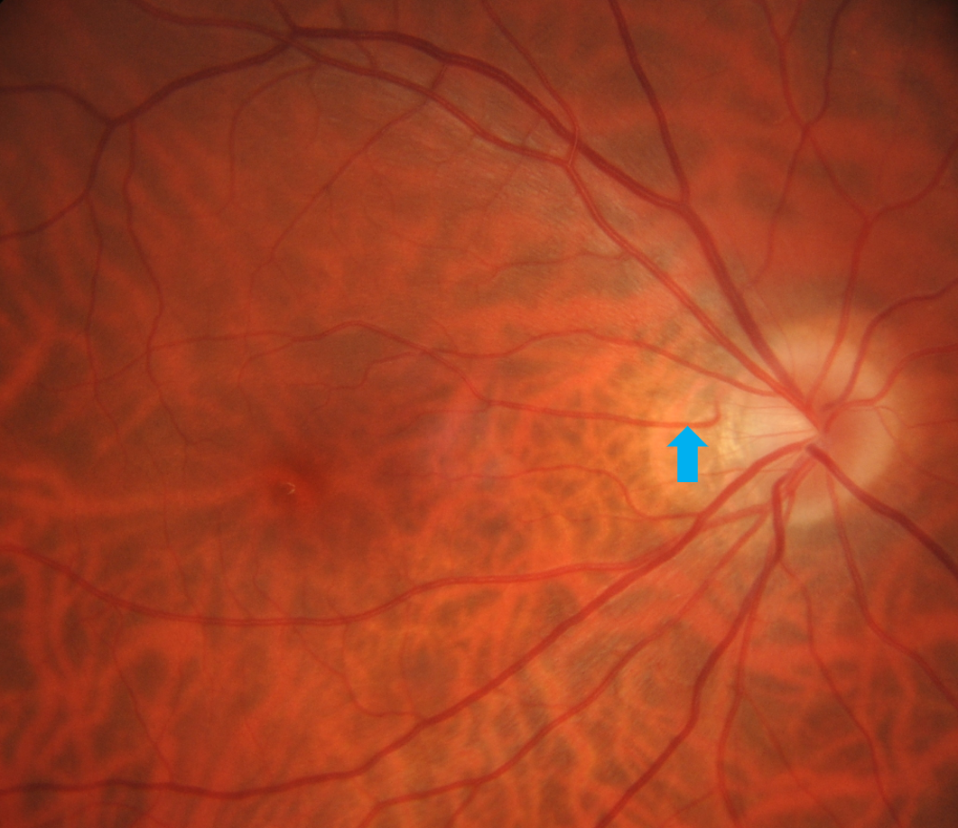 Up to 50% of the population have an additional anomalous branch of the short posterior ciliary artery or peripapillary choroid that exits the disc temporally, radiating out towards the macula. An example of a cilioretinal artery is shown in the image (indicated by the blue arrow).