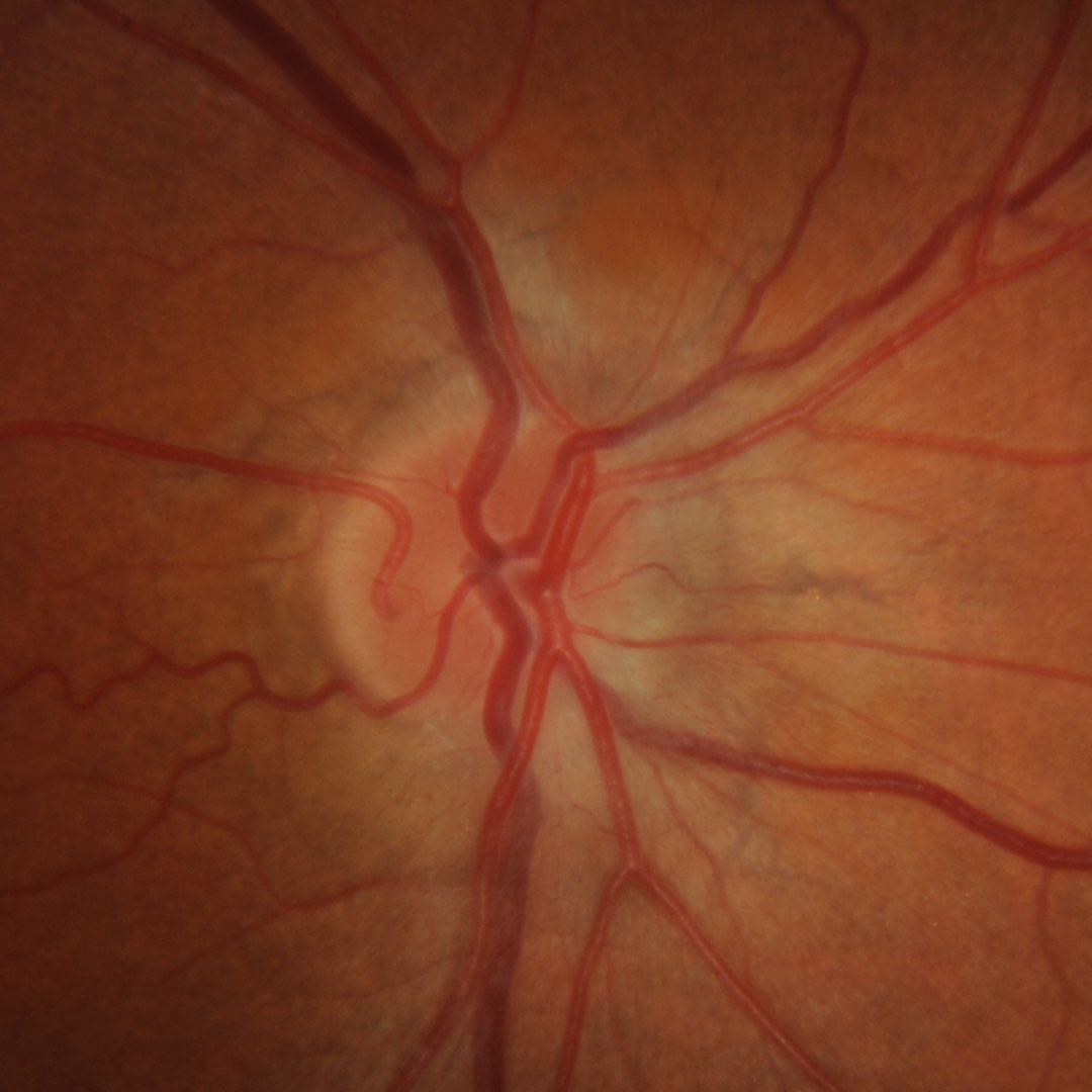 A 46-year-old Caucasian female with no known systemic conditions. Her best corrected visual acuity is 6/12 (20/40) in the right eye and 6/6 (20/20) in the left.