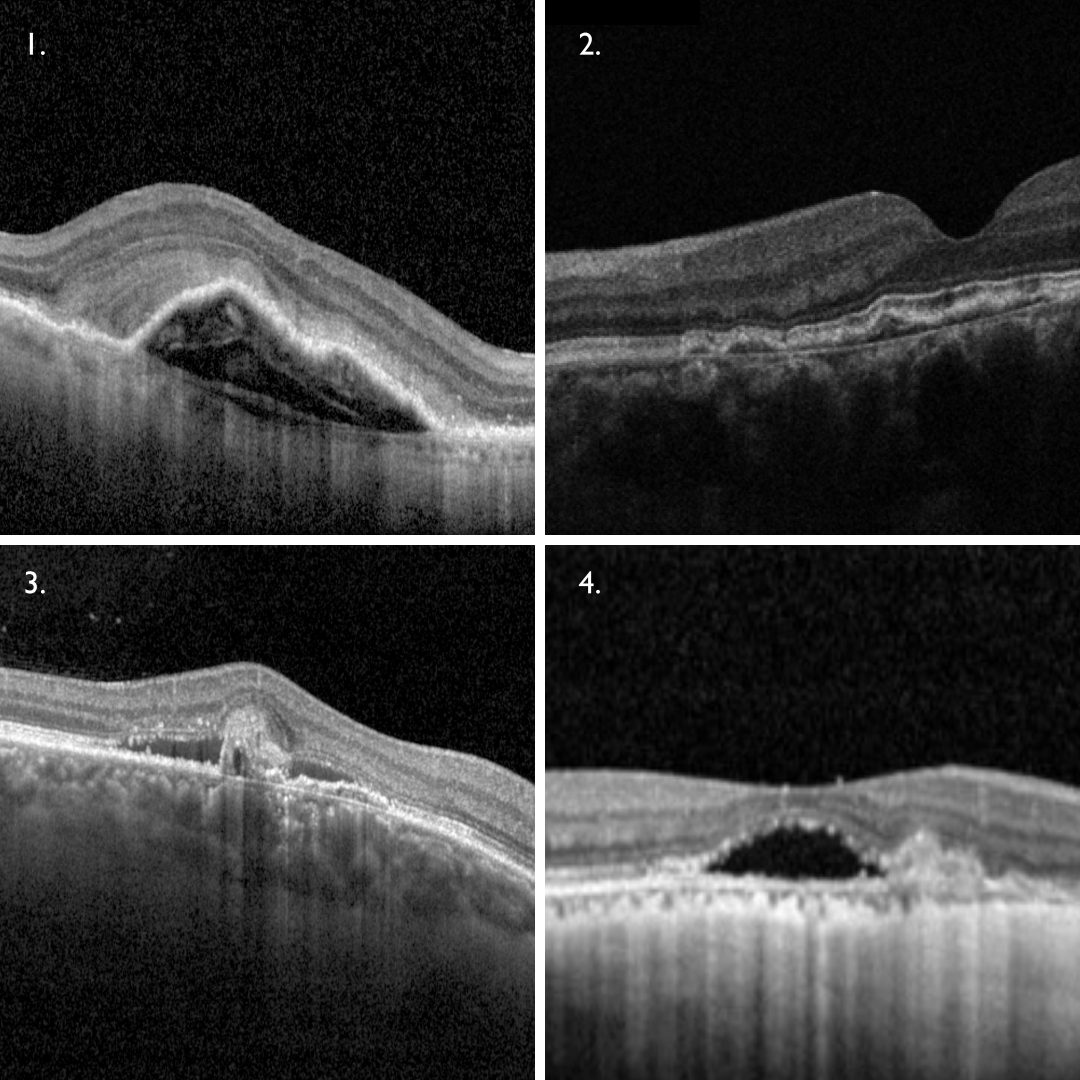 Myopic CNV is a common form of Type 2 CNV with the neovascular network proliferating into the subretinal space. It appears as a highly reflective area above the RPE (4). There is typically minimal subretinal fluid associated with this type of neovascularisation.