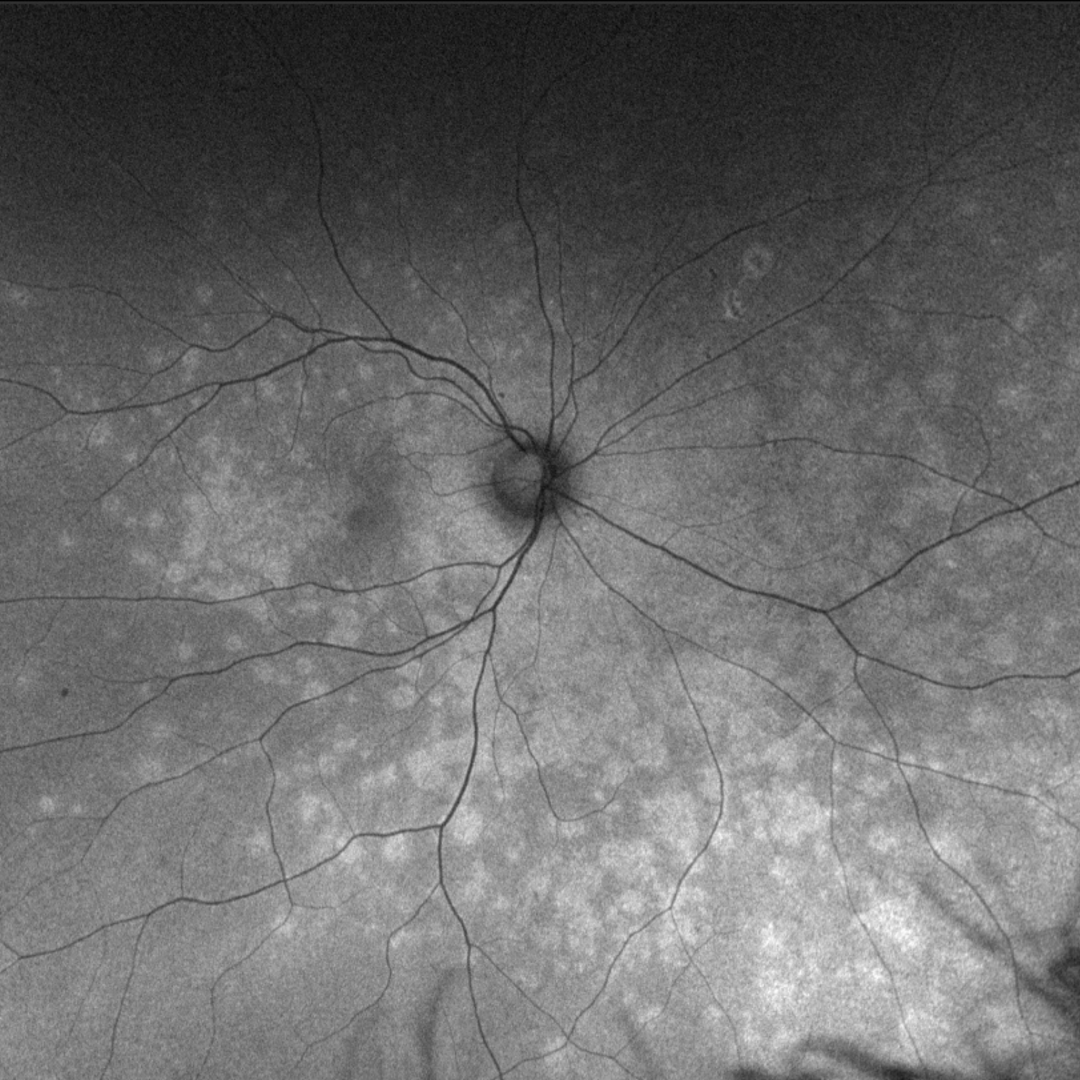 Clinically, multiple white dots may be seen throughout the retina and the fovea typically has a granular appearance. A mild vitritis and hypeaemic disc with or without blurred disc margins may also be noted in some cases.