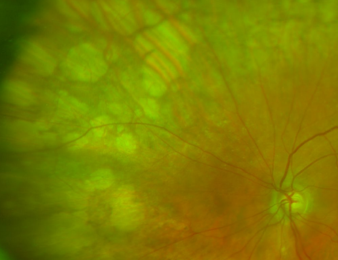 An 89-year-old female with visual acuities of 6/9+2 (20/30+2) and 6/9-2 (20/30-2) and no night vision problems or family history of inherited retinal dystrophies.
