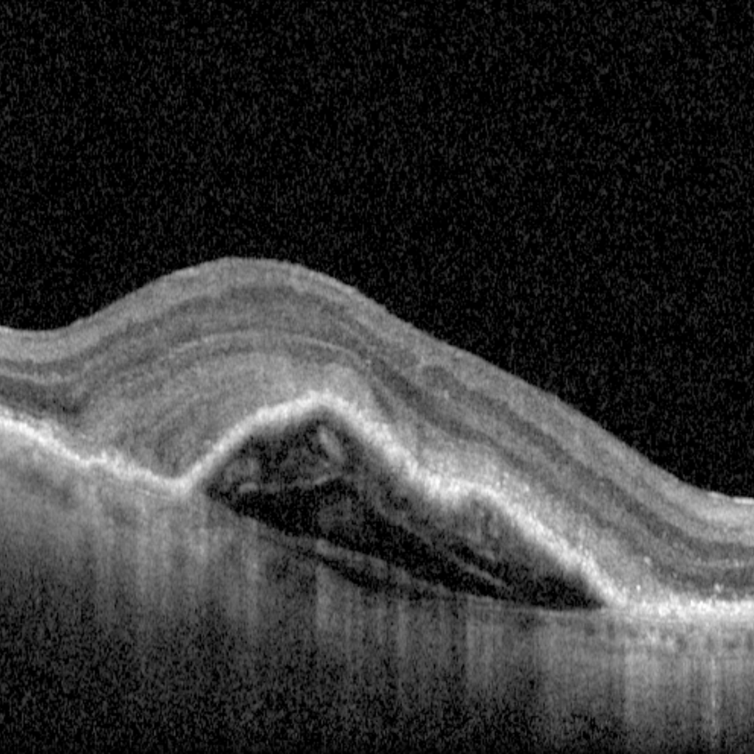 A serous PED is a localised, dome-shaped RPE elevation showing internal hypo-reflectivity in the space between the RPE and Bruch’s membrane. A serous PED does not change the reflectivity of underlying structures.