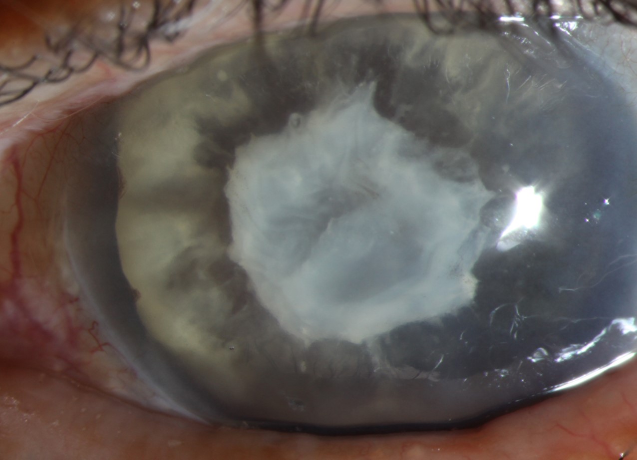 Lens induced glaucoma occurs secondary to the development of a hyper-mature cataract (similar to image shown). In phacomorphic glaucoma, the formation of the cataract can push the iris forward or obstruct the flow of aqueous between the pupil border and anterior lens (pupillary block).