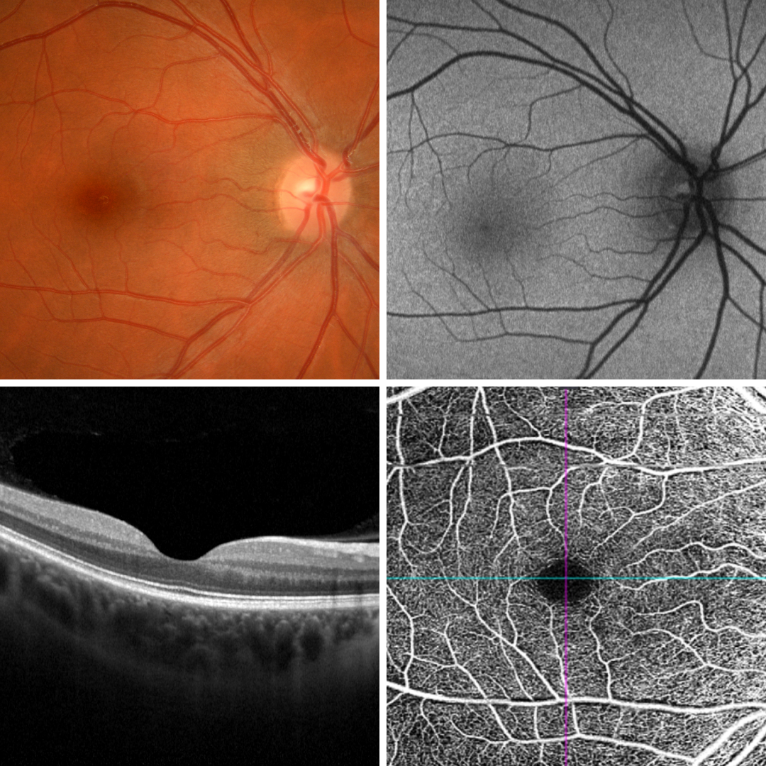 The fovea is devoid of the inner retinal layers and has a characteristic shape as seen on the OCT provided. There are also no retinal blood vessels at the fovea as seen on the OCT angiography image. The foveal avascular zone (FAZ) is approximately 0.6,, in diameter although this varies with age and can enlarge in certain diseases (eg diabetic retinopathy).