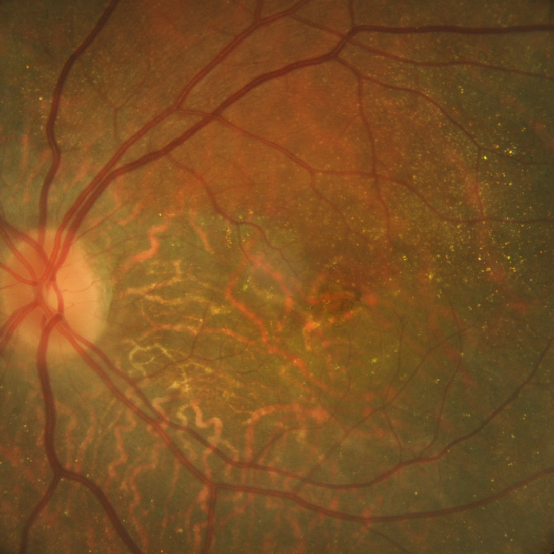 Bietti crystalline corneoretinal dystrophy (BCD) is an autosomal recessive inherited retinal dystrophy characterised by the presence of multiple, refractive crystals in the retina with associated RPE and choriocapillaris atrophy. The crystalline deposits can also be found in the peripheral cornea. It is caused by mutations in the CYP4V2 gene, which is involved in fatty acid metabolism.