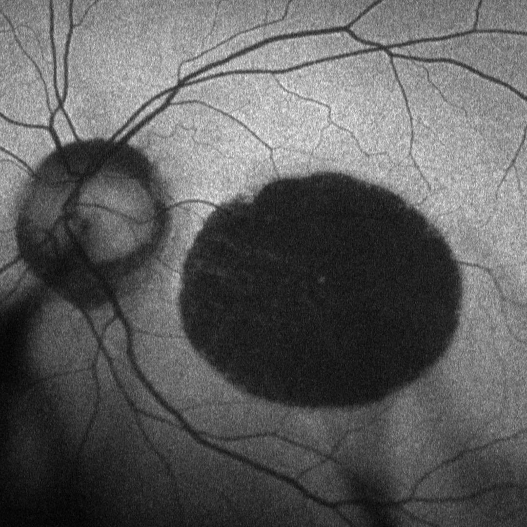 In the early stage, there is a subtle parafoveal depigmentation at the macula. The depigmentation can enlarge into a round or oval area with OCT showing irregular reflectivity in the outer photoreceptor-RPE complex and fundus autofluorescence (FAF) showing speckled hyper and hypo-autofluorescence. In later stages, well-delineated atrophy develops with FAF showing profound hypo-autofluorescence and visual acuity often decrease to less than 6/60 (20/200) once the fovea is involved. The late stage of CACD can be easily confused with geographic atrophy in age-related macular degeneration. However, in contrast to AMD, atrophic lesion in CACD shows a sharply demarcated round-to-oval configuration and is generally without drusen. Choroidal neovascularisation is rare in CACD and may occur in patients with concurrent high myopia.