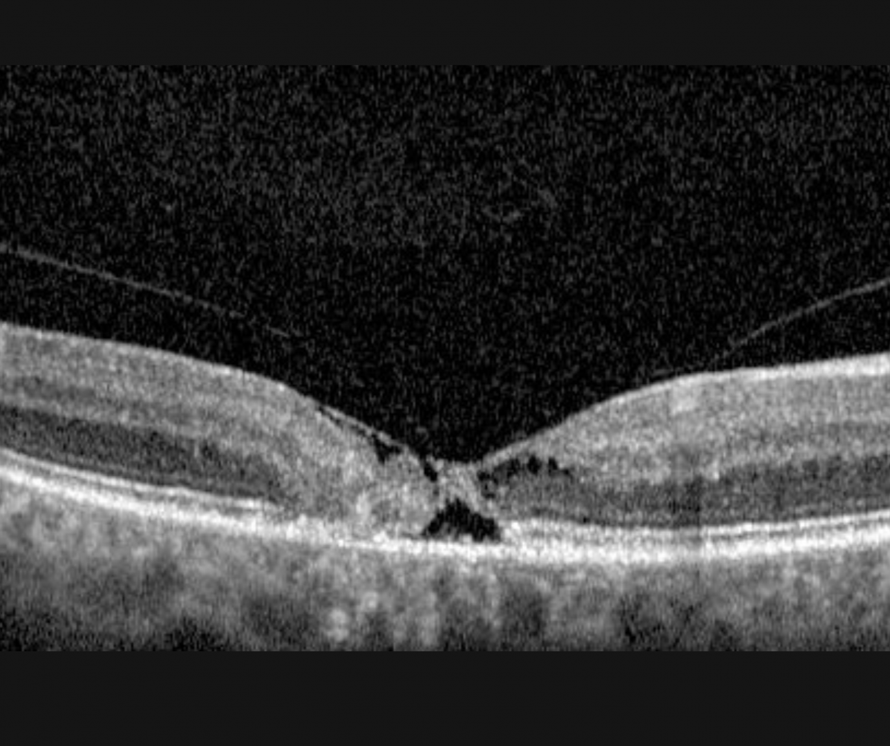 OCT features include foveal thinning, loss of the outer nuclear layer and ellipsoid zone that can progress to cystic spaces (termed ‘cavitations’) that involves all retinal layers. Often, the internal limiting membrane is spared, called ‘ILM drape’.