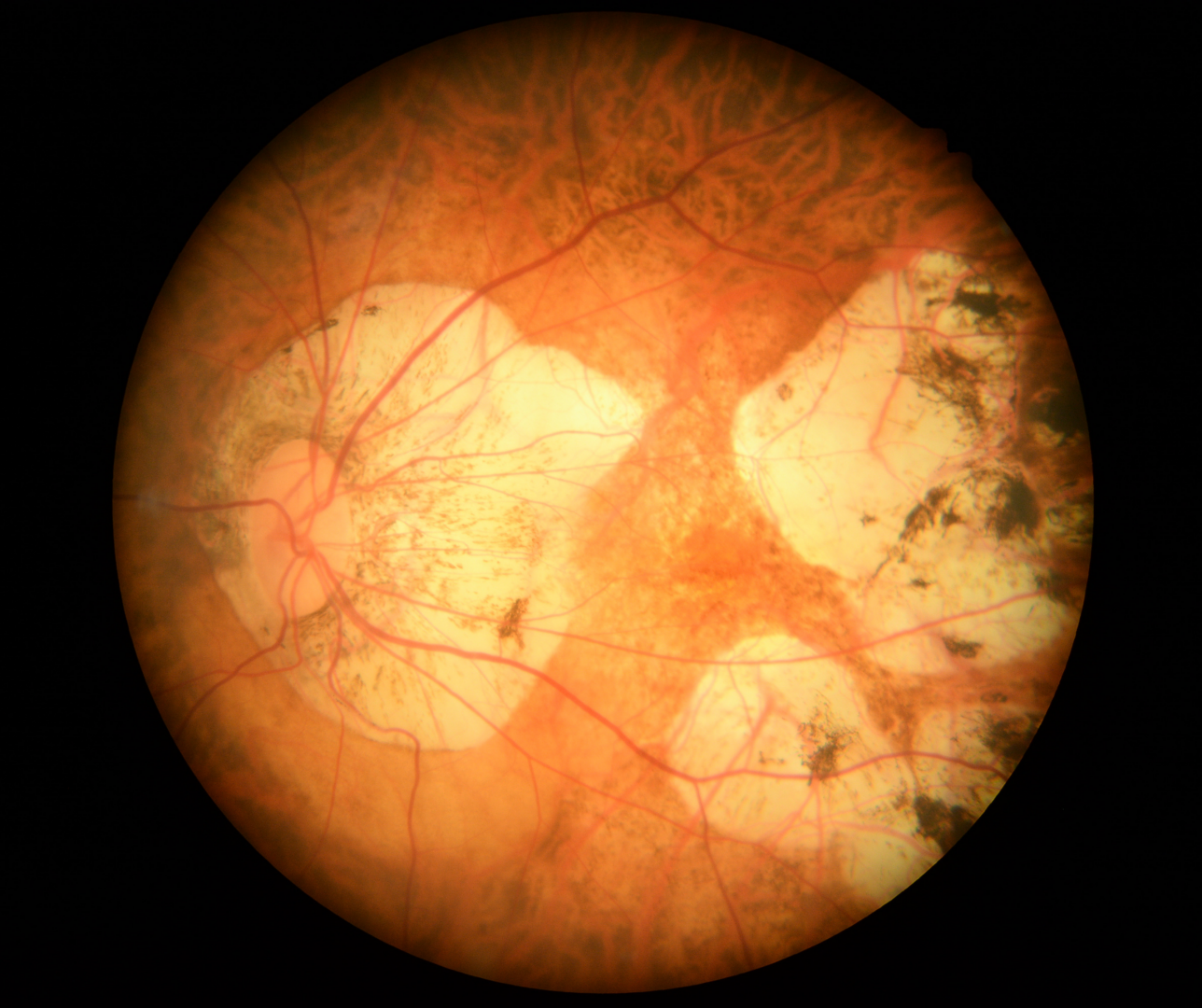 Chorioretinal atrophy (CRA) is associated with myopic maculopathy and prevalence tends to increase with age and axial length. There are typically two types of CRA described in the literature - patchy and diffuse.
