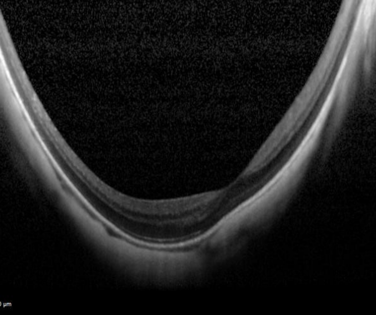 OCT imaging shows marked concavity of the sclera, choroid and retina.