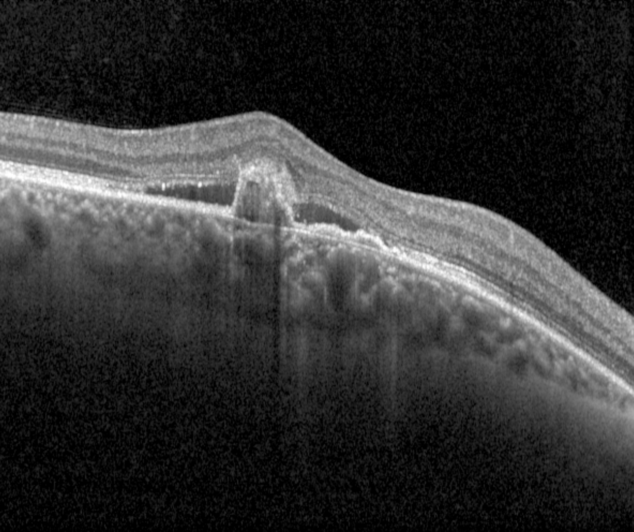 A 75 year old Asian female with best corrected visual acuity of 6/19 (20/63) in the right eye. Testing with an Amsler grid revealed distortion in the superior right quadrant when viewed with the right eye.