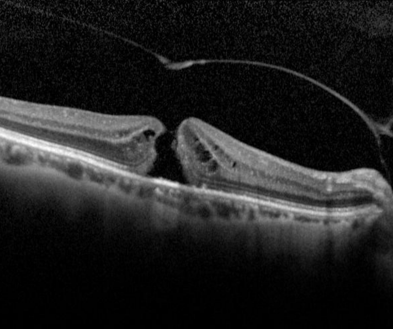 OCT shows loss of all the foveal layers from the internal limiting membrane up to (but not including) the RPE. The edge of the hole is rounded and may contain pseudocysts. The International Vitreomacular Traction Study Classification System for Mitreomacular Adhesion, Traction and Macular Hole developed a classification system for classifying a hole size by OCT measurement of its narrowest aperture.