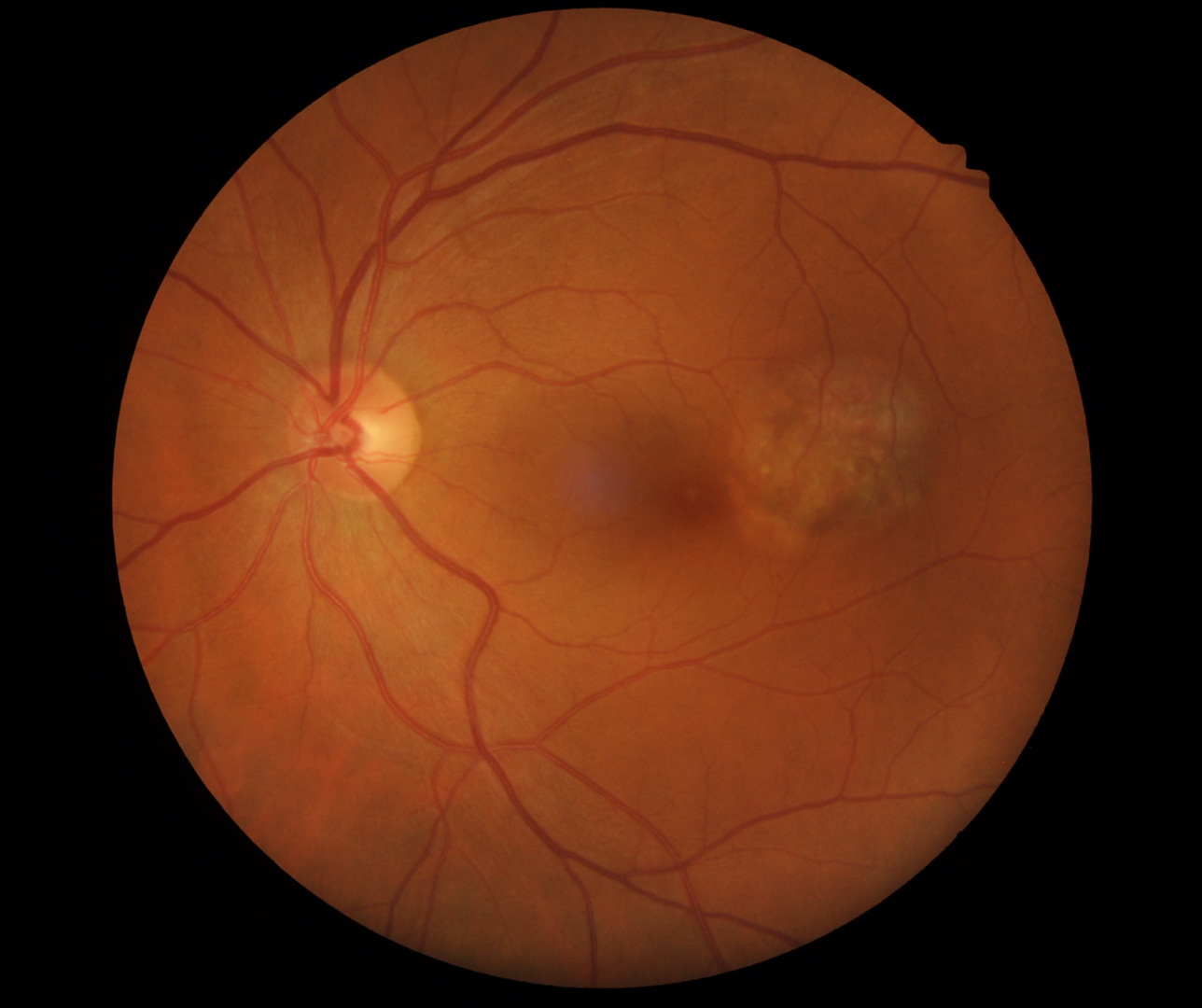 Torpedo maculopathy is unilateral, hypo-pigmented lesion of the RPE that is round in shape with a tip that points towards the central macula (“torpedo” shaped). The lesions are located temporal to the fovea.